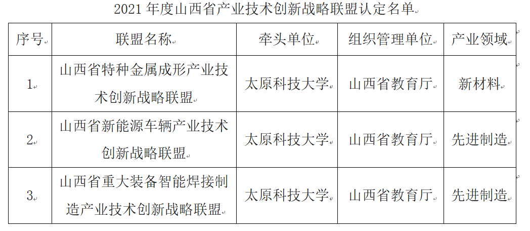 近日,山西省科技厅公布了《2021年度山西省产业技术创新战略联盟认定名单的通知》,共获批23项,365官网作为牵头单位获批3项,获批数量居全省并列第一。分别是山西省特种...